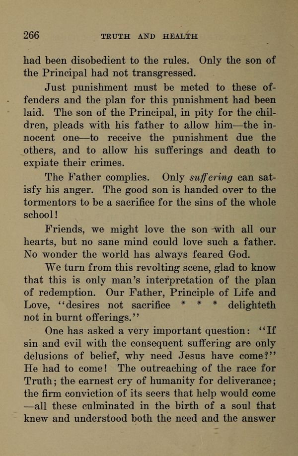 We turn from this revolting scene, glad to know that this is only man's interpretation of the plan of redemption. Our Father, Principle of Life and Love, "desires not sacrifice * * * delighteth not in burnt offerings."