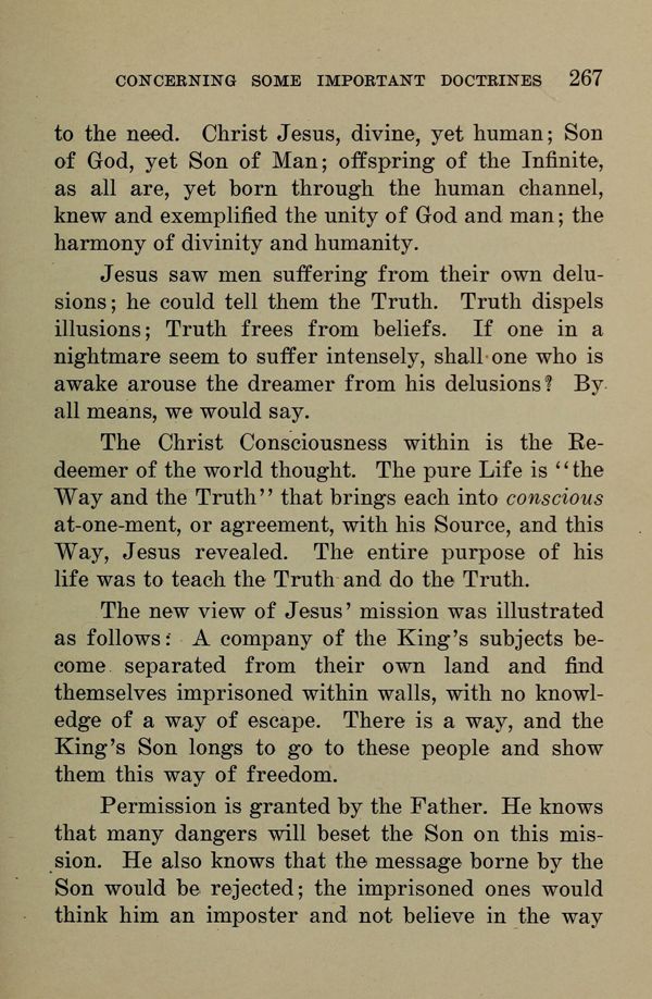 to the need. Christ Jesus, divine, yet human; Son of God, yet Son of Man; offspring of the Infinite, as all are, yet born through the human channel, knew and exemplified the unity of God and man; the harmony of divinity and humanity.