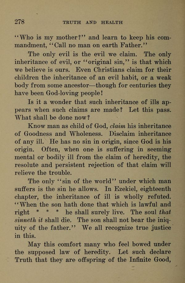Know man as child of God, claim his inheritance of Goodness and Wholeness. Disclaim inheritance of any ill. He has no sin in origin, since God is his origin. Often, when one is suffering in seeming mental or bodily ill from the claim of heredity, the resolute and persistent rejection of that claim will relieve the trouble.