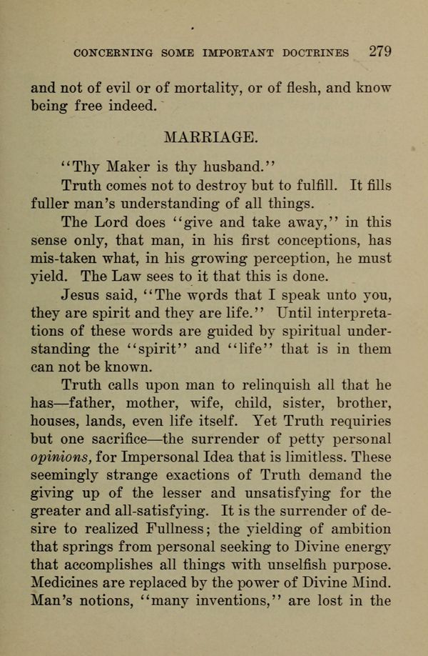 Truth calls upon man to relinquish all that he has --- father, mother, wife, child, sister, brother, houses, lands, even life itself. Yet Truth requires but one sacrifice --- the surrender of petty personal opinions, for Impersonal Idea that is limitless. These seemingly strange exactions of Truth demand the giving up of the lesser and unsatisfying for the greater and all-satisfying. It is the surrender of desire to realized Fullness the yielding of ambition that springs from personal seeking to Divine energy that accomplishes all things with unselfish purpose. Medicines are replaced by the power of Divine Mind. Man's notions, "many inventions," are lost in the