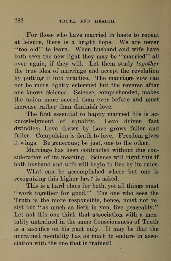 For those who have married in haste to repent at leisure, there is a bright hope. We are never "too old" to learn. When husband and wife have both seen the new light they may be "married" all over again, if they will. Let them study together the true idea of marriage and accept the revelation by putting it into practice. The marriage vow can not be more lightly esteemed but the reverse after one knows Science. Science, comprehended, makes the union more sacred than ever before and must increase rather than diminish love.