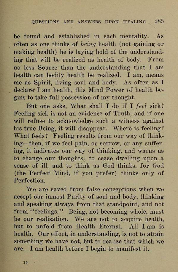 But one asks, What shall I do if I feel sick? Feeling sick is not an evidence of Truth, and if one will refuse to acknowledge such a witness against his true Being, it will disappear. Where is feeling? What feels? Feeling results from our way of thinking --- then, if we feel pain, or sorrow, or any suffering, it indicates our way of thinking, and warns us to change our thoughts to cease dwelling upon a sense of ill, and to think as God thinks, for God (the Perfect Mind, if you prefer) thinks only of Perfection.