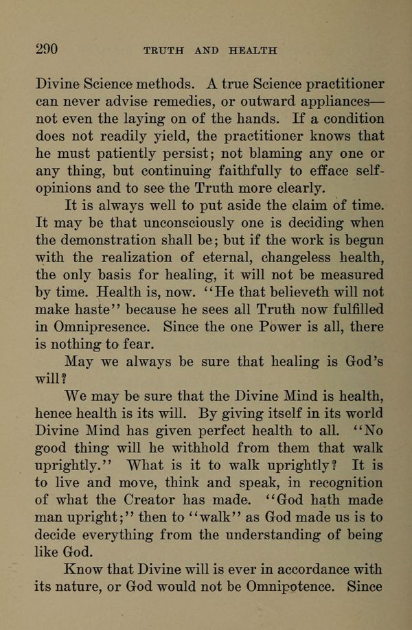 We may be sure that the Divine Mind is health, hence health is its will. By giving itself in its world Divine Mind has given perfect health to all. "No good thing will he withhold from them that walk uprightly." What is it to walk uprightly? It is to live and move, think and speak, in recognition of what the Creator has made. "God path made man upright;" then to "walk" as God made us is to decide everything from the understanding of being like God.