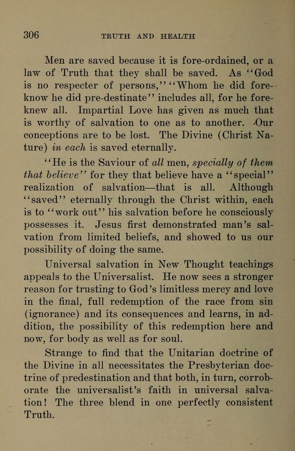 Universal salvation in New Thought teachings appeals to the Universalist. He now sees a stronger reason for trusting to God's limitless mercy and love in the final, full redemption of the race from sin (ignorance) and its consequences and learns, in addition, the possibility of this redemption here and now, for body as well as for soul.