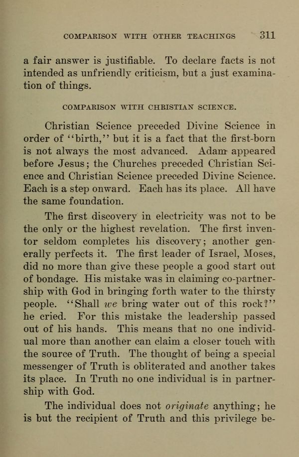 Christian Science preceded Divine Science in order of "birth," but it is a fact that the first-born is not always the most advanced. Adam- appeared before Jesus; the Churches preceded Christian Science and Christian Science preceded Divine Science. Each is a step onward. Each has its place. All have the same foundation.
