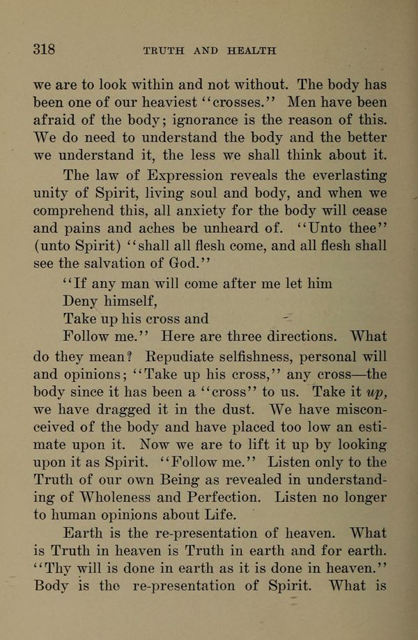 "If any man will come after me let him Deny himself, Take up his cross and Follow me." Here are three directions. What do they mean? Repudiate selfishness, personal will and opinions; "Take up his cross," any cross --- the body since it has been a "cross" to us. Take it up, we have dragged it in the dust. We have misconceived of the body and have placed too low an estimate upon it. Now we are to lift it up by looking upon it as Spirit. "Follow me." Listen only to the Truth of our own Being as revealed in understanding of Wholeness and Perfection. Listen no longer to human opinions about Life.