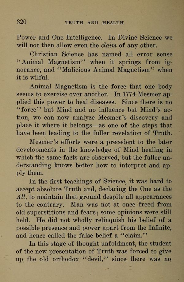 Animal Magnetism is the force that one body seems to exercise over another. In 1774 Mesmer applied this power to heal diseases. Since there is no "force" but Mind and no influence but Mind's action, we can now analyze Mesmer's discovery and place it where it belongs --- as one of the steps that have been leading to the fuller revelation of Truth.