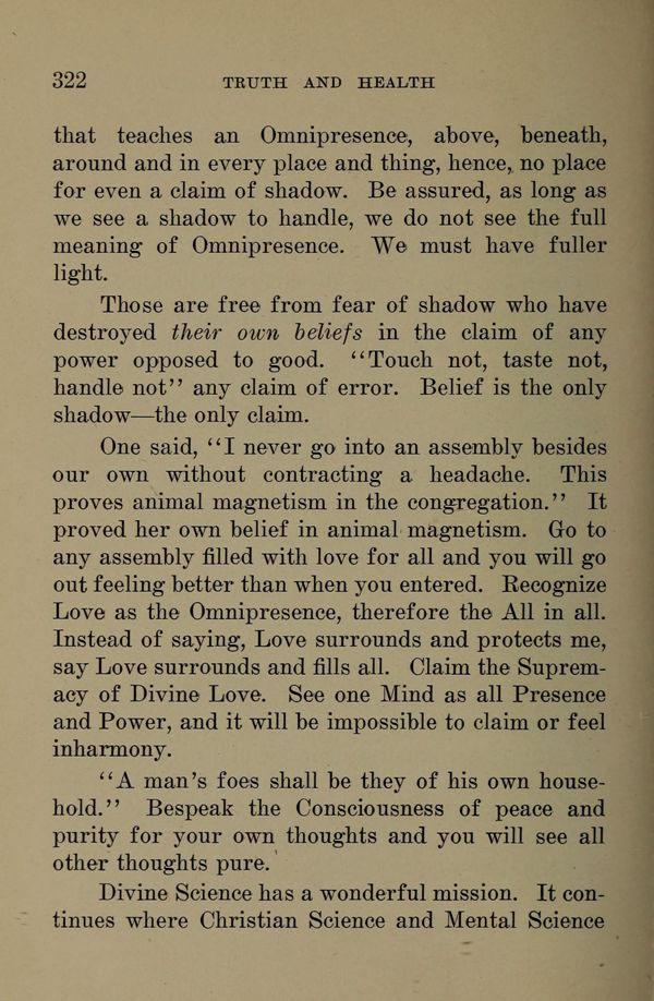 Those are free from fear of shadow who have destroyed their own beliefs in the claim of any power opposed to good. "Touch not, taste not, handle not" any claim of error. Belief is the only shadow --- the only claim.