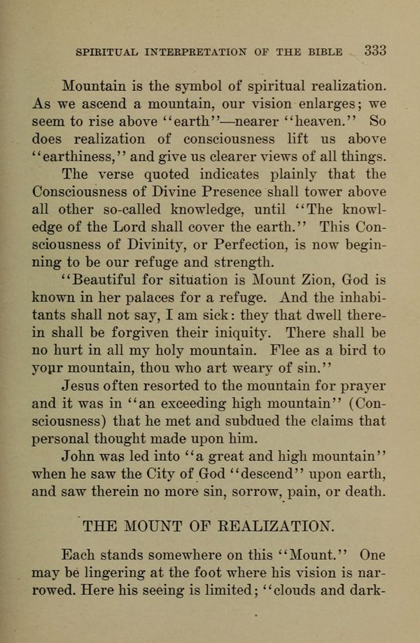 Jesus often resorted to the mountain for prayer and it was in "an exceeding high mountain" (Consciousness) that he met and subdued the claims that personal thought made upon him.