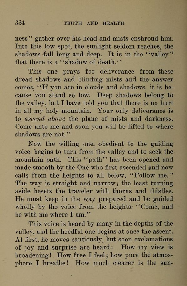 This one prays for deliverance from these dread shadows and blinding mists and the answer comes, "If you are in clouds and shadows, it is because you stand so low. Deep shadows belong to the valley, but I have told you that there is no hurt in all my holy mountain. Your only deliverance is to ascend above the plane of mists and darkness. Come unto me and soon you will be lifted to where shadows are not."
