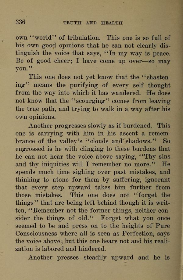 Another progresses slowly as if burdened. This one is carrying with him in his ascent a remembrance of the valley's "clouds and shadows." So engrossed is he with clinging to these burdens that he can not hear the voice above saying, "Thy sins and thy iniquities will I remember no more." He spends much time sighing over past mistakes, and thinking to atone for them by suffering, ignorant that every step upward takes him further from those mistakes. This one does not "forget the things" that are being left behind though it is written, "Remember not the former things, neither consider the things of old." Forget what you once seemed to be and press on to the heights of Pure Consciousness where all is seen as Perfection, says the voice above; but this one hears not and his realization is labored and hindered.
