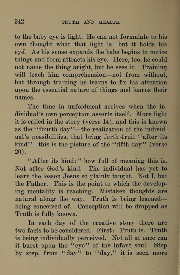 The time in unfoldment arrives when the individual's own perception asserts itself. More light it is called in the story (verse 14), and this is known as the "fourth day" --- the realization of the individual's possibilities, that bring forth-fruit "after its kind" --- this is the picture of the "fifth day" (verse 20). "After its kind;" how full of meaning this is. Not after God's kind. The individual has yet to learn the lesson Jesus so plainly taught. Not I, but the Father. This is the point to which the developing mentality is reaching. Mistaken thoughts are natural along the way. Truth is being learned --- being conceived of. Conception will be dropped as Truth is fully known.