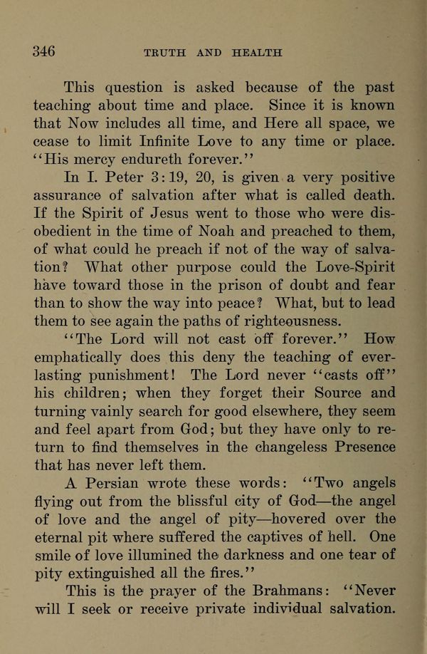 In I. Peter 3: 19, 20, is given a very positive assurance of salvation after what is called death. If the Spirit of Jesus went to those who were disobedient in the time of Noah and preached to them, of what could he preach if not of the way of salvation? What other purpose could the Love-Spirit have toward those in the prison of doubt and fear than to show the way into peace? What, but to lead them to see again the paths of righteousness.