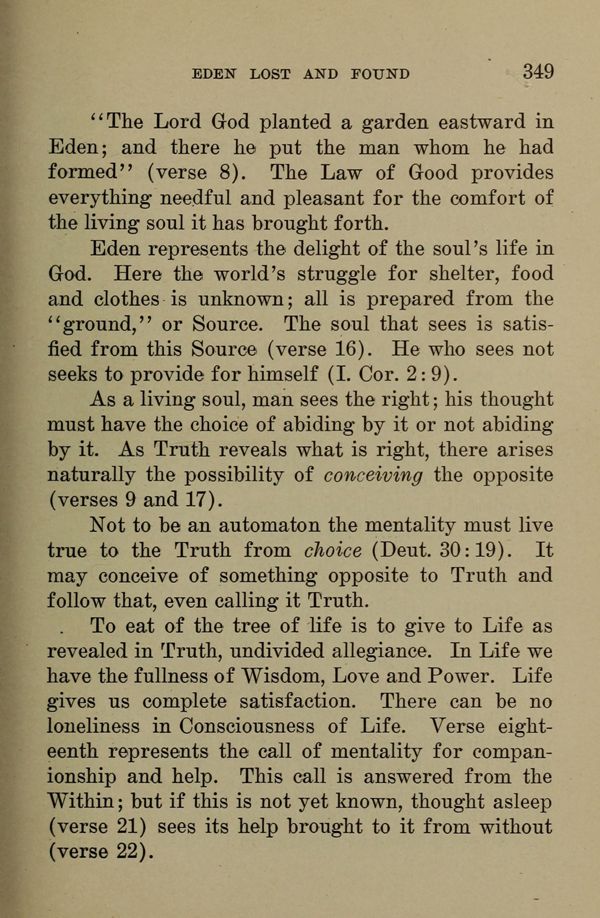 . To eat of the tree of life is to give to Life as revealed in Truth, undivided allegiance. In Life we have the fullness of Wisdom, Love and Power. Life gives us complete satisfaction. There can be no loneliness in Consciousness of Life. Verse eighteenth represents the call of mentality for companionship and help. This call is answered from the Within; but if this is not yet known, thought asleep (verse 21) sees its help brought to it from without (verse 22).