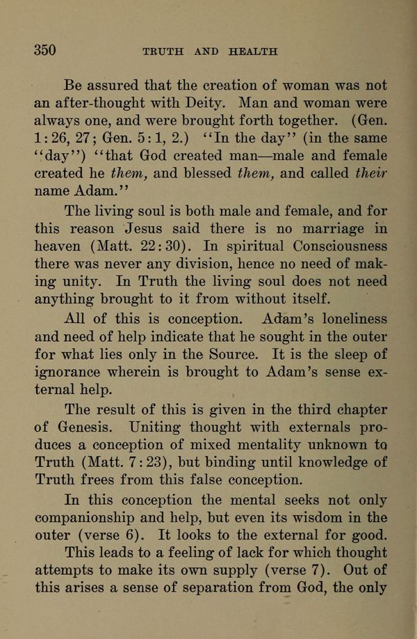 The living soul is both male and female, and for this reason Jesus said there is no marriage in heaven (Matt. 22: 30). In spiritual Consciousness there was never any division, hence no need of making unity. In Truth the living soul does not need anything brought to it from without itself.