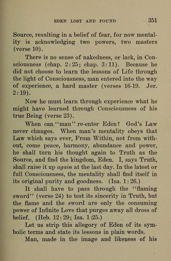 When can "man" re-enter Eden? God's Law never changes. When man's mentality obeys that Law which says ever, From Within, not from without, come peace, harmony, abundance and power, he shall turn his thought again to Truth as the Source, and find the kingdom, Eden. I, says Truth, shall raise it up again at the last day. In the latest or full Consciousness, the mentality shall find itself in its original purity and goodness. (Isa. 1: 26.)