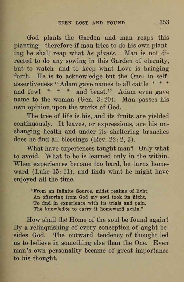 God plants the Garden and man reaps this planting --- therefore if man tries to do his own planting he shall reap what he plants. Man is not directed to do any sowing in this Garden of eternity, but to watch and to keep what Love is bringing forth. He is to acknowledge but the One: in self-assertiveness "Adam gave names to all cattle and fowl and beast." Adam even gave name to the woman (Gen. 3: 20). Man passes his own opinion upon the works of God.