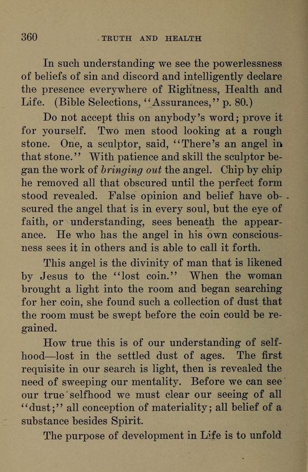 Do not accept this on anybody's word, prove it for yourself. Two men stood looking at a rough stone. One, a sculptor, said, "There's an angel in that stone." With patience and skill the sculptor began the work of bringing out the angel. Chip by chip he removed all that obscured until the perfect form stood revealed. False opinion and belief have obscured the angel that is in every soul, but the eye of faith, or understanding, sees beneath the appearance. He who has the angel in his own consciousness sees it in others and is able to call it forth.