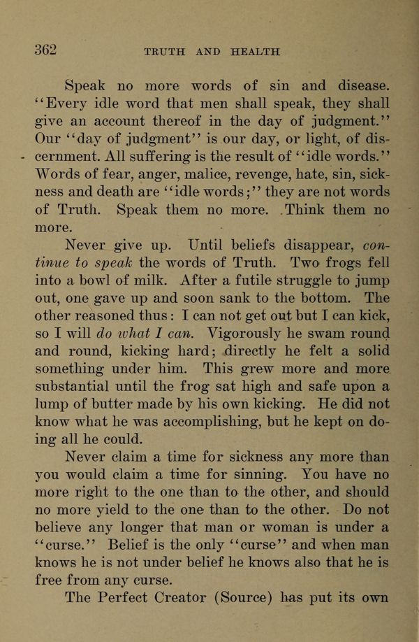 Speak no more words of sin and disease. "Every idle word that men shall speak, they shall give an account thereof in the day of judgment. "Our" day of judgment" is our day, or light, of discernment. All suffering is the result of "idle words." Words of fear, anger, malice, revenge, hate, sin, sickness and death are "idle words;" they are not words of Truth. Speak them no more. Think them no more.