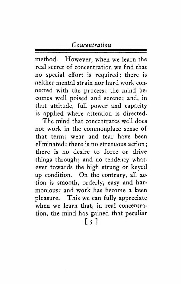 method. However, when we learn the real secret of concentration we find that no special effort is required; there is neither mental strain nor hard work connected with the process; the mind becomes well poised and serene; and, in that attitude, full power and capacity is applied where attention is directed. The mind that concentrates well does not work in the commonplace sense of that term; wear and tear have been eliminated; there is no strenuous action; there is no desire to force or drive things through; and no tendency whatever towards the high strung or keyed up condition. On the contrary, all action is smooth, orderly, easy and harmonious; and work has become a keen pleasure. This we can fully appreciate when we learn that, in real concentration, the mind has gained that peculiar
