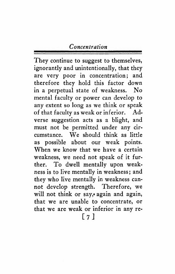 They continue to suggest to themselves, ignorantly and unintentionally, that they are very poor in concentration; and therefore they hold this factor down in a perpetual state of weakness. No mental faculty or power can develop to any extent so long as we think or speak of that faculty as weak or inferior. Adverse suggestion acts as a blight, and must not be permitted under any circumstance. We should think as little as possible about our weak points. When we know that we have a certain weakness, we need not speak of it further. To dwell mentally upon weakness is to live mentally in weakness; and they who live mentally in weakness cannot develop strength. Therefore, we will not think or say,» again and again, that we are unable to concentrate, or that we are weak or inferior in any respect