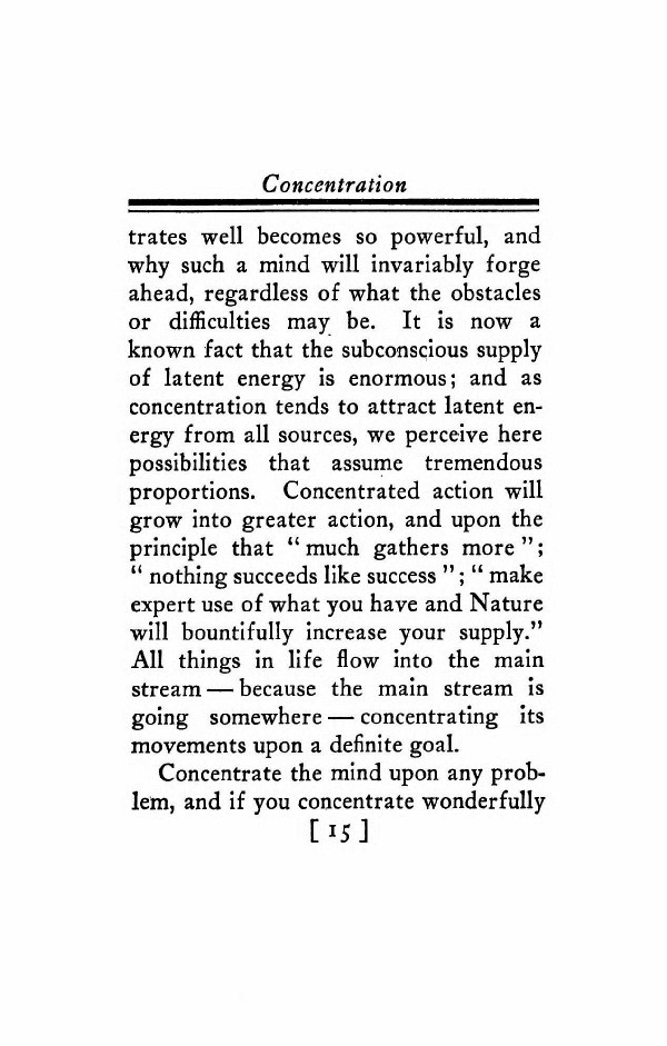 well becomes so powerful, and why such a mind will invariably forge ahead, regardless of what the obstacles or difficulties may be. It is now a known fact that the subconscious supply of latent energy is enormous; and as concentration tends to attract latent energy from all sources, we perceive here possibilities that assume tremendous proportions. Concentrated action will grow into greater action, and upon the principle that "much gathers more"; "nothing succeeds like success"; "make expert use of what you have and Nature will bountifully increase your supply." All things in life flow into the main stream -- because the main stream is going somewhere -- concentrating its movements upon a definite goal.