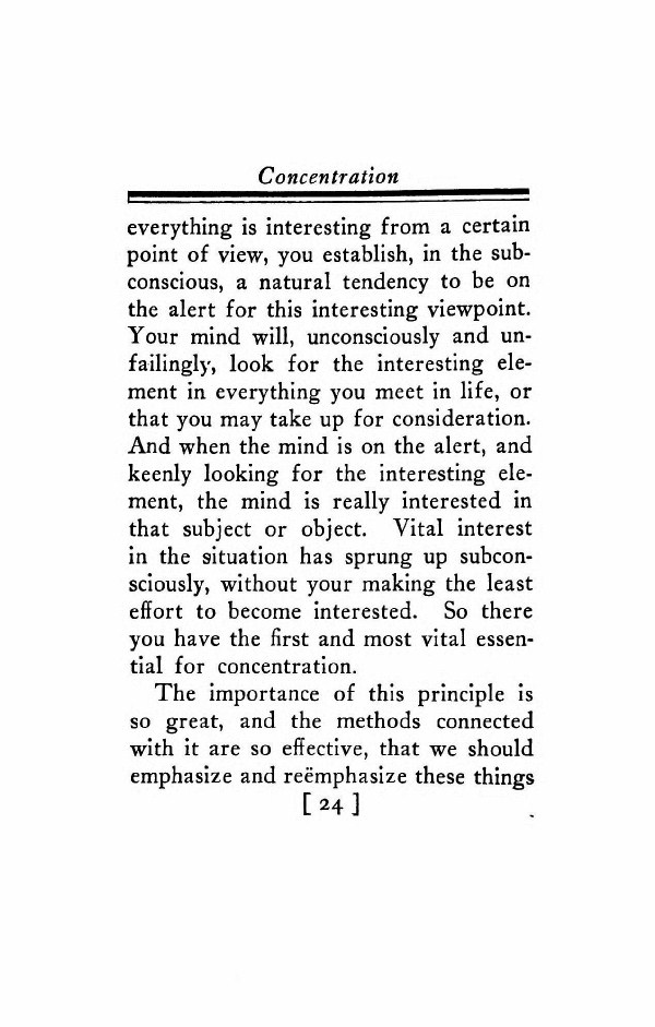 everything is interesting from a certain point of view, you establish, in the subconscious, a natural tendency to be on the alert for this interesting viewpoint. Your mind will, unconsciously and unfailingly, look for the interesting element in everything you meet in life, or that you may take up for consideration. And when the mind is on the alert, and keenly looking for the interesting element, the mind is really interested in that subject or object. Vital interest in the situation has sprung up subconsciously, without your making the least effort to become interested. So there you have the first and most vital essential for concentration.