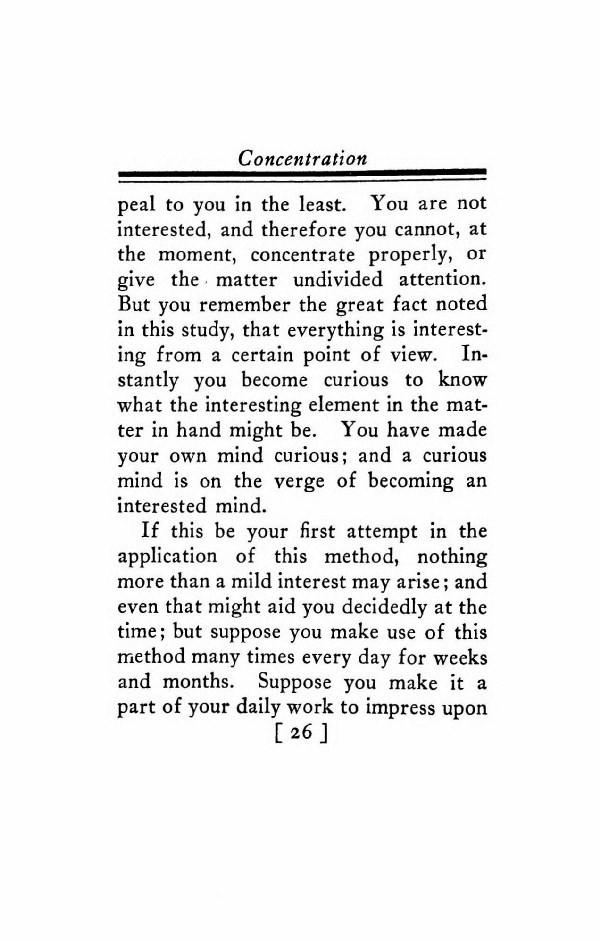 to you in the least. You are not interested, and therefore you cannot, at the moment, concentrate properly, or give the matter undivided attention. But you remember the great fact noted in this study, that everything is interesting from a certain point of view. Instantly you become curious to know what the interesting element in the matter in hand might be. You have made your own mind curious; and a curious mind is on the verge of becoming an interested mind.