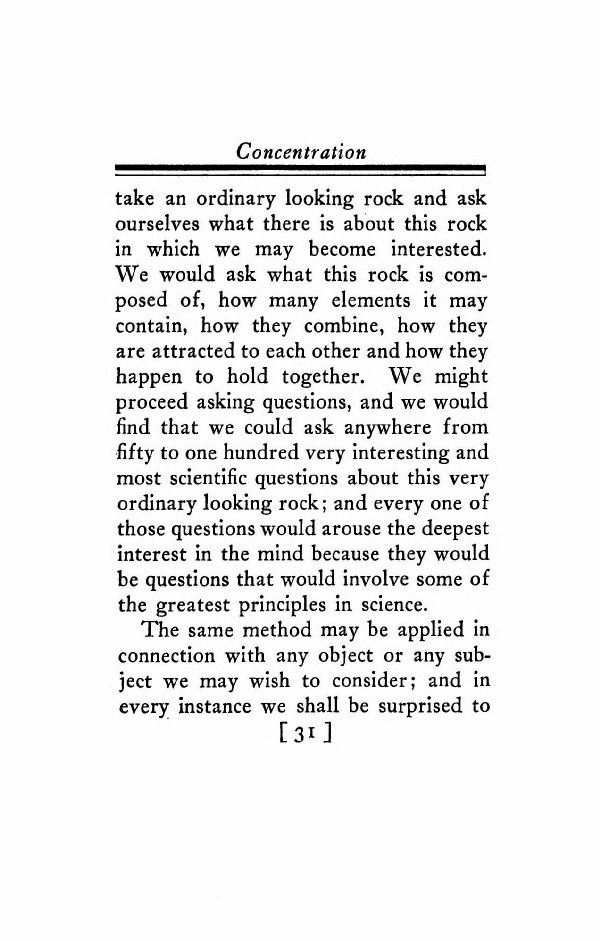take an ordinary looking rock and ask ourselves what there is about this rock in which we may become interested. We would ask what this rock is composed of, how many elements it may contain, how they combine, how they are attracted to each other and how they happen to hold together. We might proceed asking questions, and we would find that we could ask anywhere from fifty to one hundred very interesting and most scientific questions about this very ordinary looking rock; and every one of those questions would arouse the deepest interest in the mind because they would be questions that would involve some of the greatest principles in science.