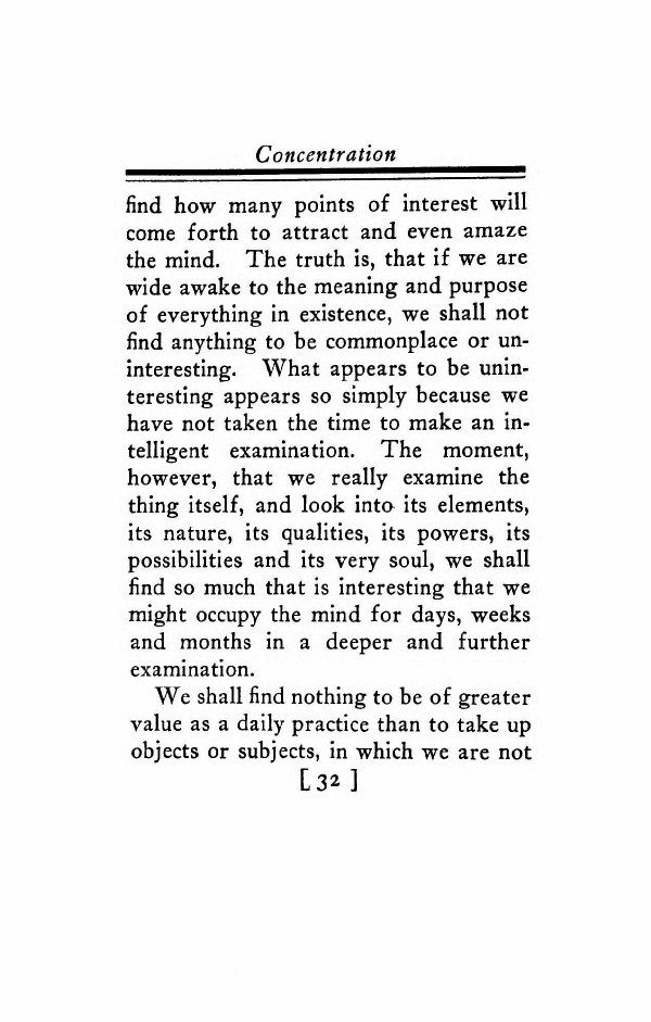 find how many points of interest will come forth to attract and even amaze the mind. The truth is, that if we are wide awake to the meaning and purpose of everything in existence, we shall not find anything to be commonplace or uninteresting. What appears to be uninteresting appears so simply because we have not taken the time to make an intelligent examination. The moment, however, that we really examine the thing itself, and look into its elements, its nature, its qualities, its powers, its possibilities and its very soul, we shall find so much that is interesting that we might occupy the mind for days, weeks and months in a deeper and further examination.