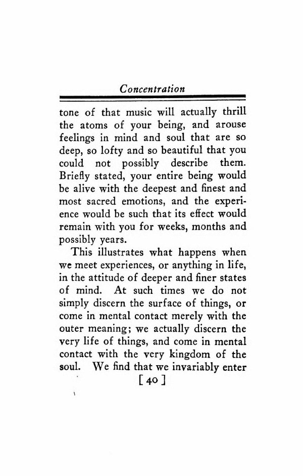 This illustrates what happens when we meet experiences, or anything in life, in the attitude of deeper and finer states of mind. At such times we do not simply discern the surface of things, or come in mental contact merely with the outer meaning; we actually discern the very life of things, and come in mental contact with the very kingdom of the soul. We find that we invariably enter