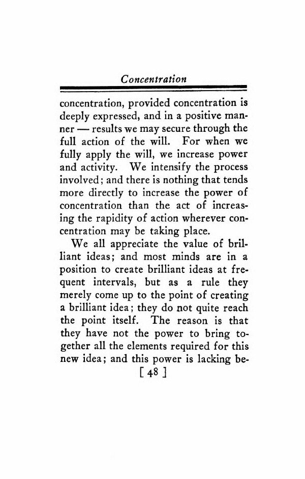 concentration, provided concentration is deeply expressed, and in a positive manner -- results we may secure through the full action of the will. For when we fully apply the will, we increase power and activity. We intensify the process involved; and there is nothing that tends more directly to increase the power of concentration than the act of increasing the rapidity of action wherever concentration may be taking place.