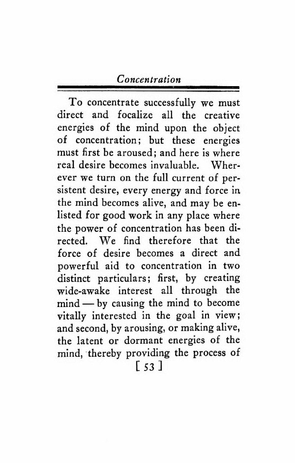 To concentrate successfully we must direct and focalize all the creative energies of the mind upon the object of concentration; but these energies must first be aroused; and here is where real desire becomes invaluable. Wherever we turn on the full current of persistent desire, every energy and force in the mind becomes alive, and may be enlisted for good work in any place where the power of concentration has been directed. We find therefore that the force of desire becomes a direct and powerful aid to concentration in two distinct particulars; first, by creating wide-awake interest all through the mind -- by causing the mind to become vitally interested in the goal in view; and second, by arousing, or making alive, the latent or dormant energies of the mind, thereby providing the process of