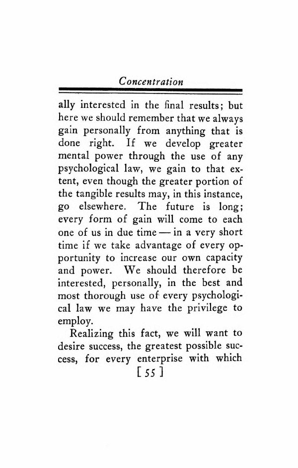 interested in the final results; but here we should remember that we always gain personally from anything that is done right. If we develop greater mental power through the use of any psychological law, we gain to that extent, even though the greater portion of the tangible results may, in this instance, go elsewhere. The future is long; every form of gain will come to each one of us in due time -- in a very short time if we take advantage of every opportunity to increase our own capacity and power. We should therefore be interested, personally, in the best and most thorough use of every psychological law we may have the privilege to employ.