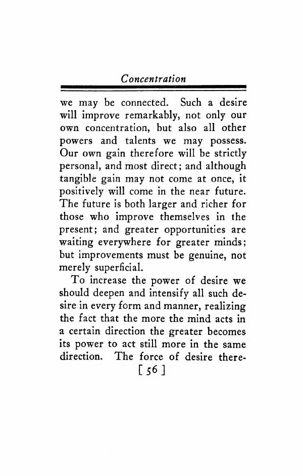we may be connected. Such a desire will improve remarkably, not only our own concentration, but also all other powers and talents we may possess. Our own gain therefore will be strictly personal, and most direct; and although tangible gain may not come at once, it positively will come in the near future. The future is both larger and richer for those who improve themselves in the present; and greater opportunities are waiting everywhere for greater minds; but improvements must be genuine, not merely superficial.