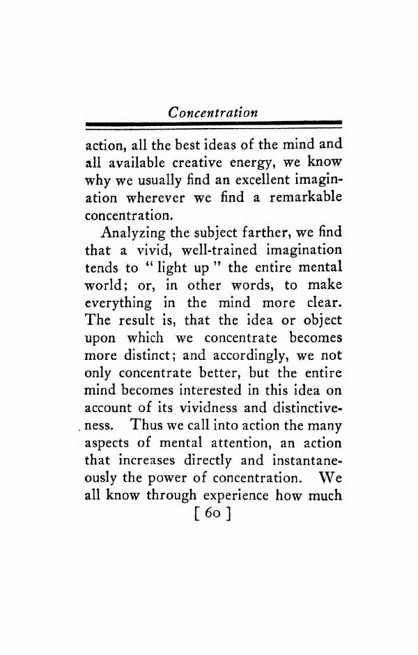 Analyzing the subject farther, we find that a vivid, well-trained imagination tends to "light up" the entire mental world; or, in other words, to make everything in the mind more clear. The result is, that the idea or object upon which we concentrate becomes more distinct; and accordingly, we not only concentrate better, but the entire mind becomes interested in this idea on account of its vividness and distinctiveness. Thus we call into action the many aspects of mental attention, an action that increases directly and instantaneously the power of concentration. We all know through experience how much
