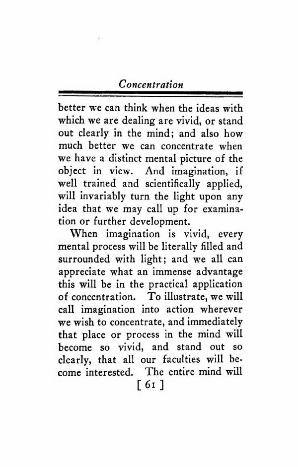 better we can think when the ideas with which we are dealing are vivid, or stand out clearly in the mind; and also how much better we can concentrate when we have a distinct mental picture of the object in view. And imagination, if well trained and scientifically applied, will invariably turn the light upon any idea that we may call up for examination or further development.