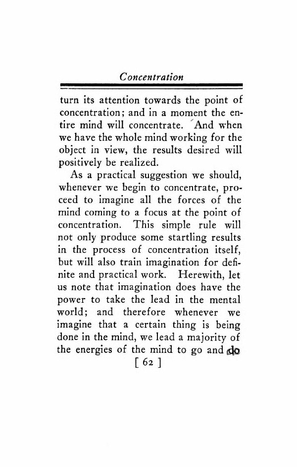 As a practical suggestion we should, whenever we begin to concentrate, proceed to imagine all the forces of the mind coming to a focus at the point of concentration. This simple rule will not only produce some startling results in the process of concentration itself, but will also train imagination for definite and practical work. Herewith, let us note that imagination does have the power to take the lead in the mental world; and therefore whenever we imagine that a certain thing is being done in the mind, we lead a majority of the energies of the mind to go and do