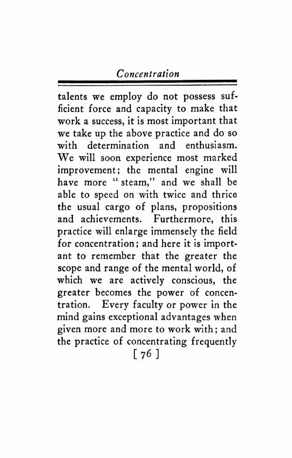 talents we employ do not possess sufficient force and capacity to make that work a success, it is most important that we take up the above practice and do so with determination and enthusiasm. We will soon experience most marked improvement; the mental engine will have more "steam," and we shall be able to speed on with twice and thrice the usual cargo of plans, propositions and achievements. Furthermore, this practice will enlarge immensely the field for concentration; and here it is important to remember that the greater the scope and range of the mental world, of which we are actively conscious, the greater becomes the power of concentration. Every faculty or power in the mind gains exceptional advantages when given more and more to work with; and the practice of concentrating frequently