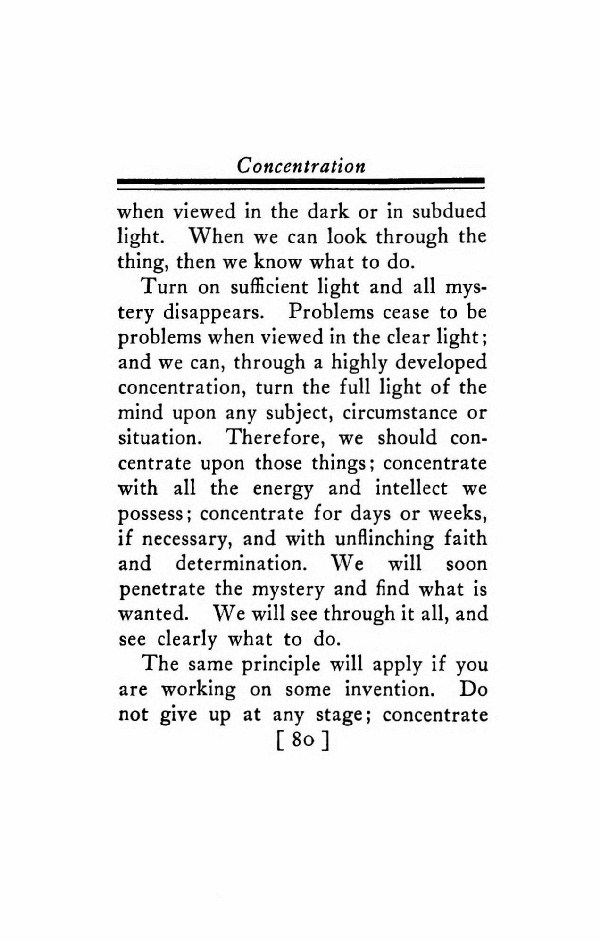 Turn on sufficient light and all mystery disappears. Problems cease to be problems when viewed in the clear light; and we can, through a highly developed concentration, turn the full light of the mind upon any subject, circumstance or situation. Therefore, we should concentrate upon those things; concentrate with all the energy and intellect we possess; concentrate for days or weeks, if necessary, and with unflinching faith and determination. We will soon penetrate the mystery and find what is wanted. We will see through it all, and see clearly what to do.