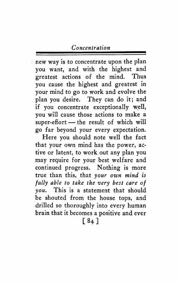 new way is to concentrate upon the plan you want, and with the highest and greatest actions of the mind. Thus you cause the highest and greatest in your mind to go to work and evolve the plan you desire. They can do it; and if you concentrate exceptionally well, you will cause those actions to make a super-effort -- the result of which will go far beyond your every expectation. Here you should note well the fact that your own mind has the power, active or latent, to work out any plan you may require for your best welfare and continued progress. Nothing is more true than this, that your own mind is fully able to take the very best care of you. This is a statement that should be shouted from the house tops, and drilled so thoroughly into every human brain that it becomes a positive and ever