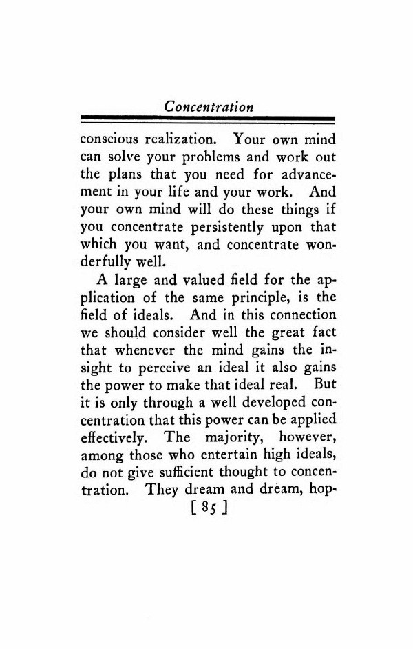 A large and valued field for the application of the same principle, is the field of ideals. And in this connection we should consider well the great fact that whenever the mind gains the insight to perceive an ideal it also gains the power to make that ideal real. But it is only through a well developed concentration that this power can be applied effectively. The majority, however, among those who entertain high ideals, do not give sufficient thought to concentration. They dream and dream, hoping