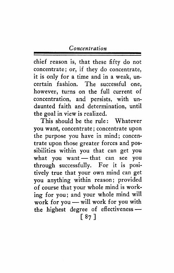 This should be the rule : Whatever you want, concentrate; concentrate upon the purpose you have in mind; concentrate upon those greater forces and possibilities within you that can get you what you want -- that can see you through successfully. For it is positively true that your own mind can get you anything within reason; provided of course that your whole mind is working for you; and your whole mind will work for you -- will work for you with the highest degree of effectiveness --