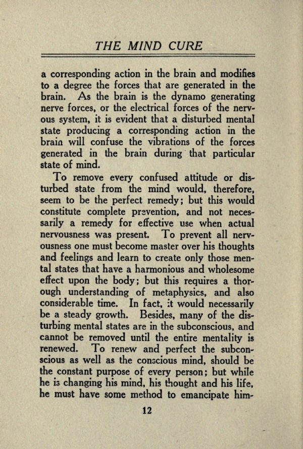 To remove every confused attitude or disturbed state from the mind would, therefore, seem to be the perfect remedy; but this would constitute complete prevention, and not necessarily a remedy for effective use when actual nervousness was present. To prevent all nervousness one must become master over his thoughts and feelings and learn to create only those mental states that have a harmonious and wholesome effect upon the body; but this requires a thorough understanding of metaphysics, and also considerable time. In fact, it would necessarily be a steady growth. Besides, many of the disturbing mental states are in the subconscious, and cannot be removed until the entire mentality is renewed. To renew and perfect the subconscious as well as the conscious mind, should be the constant purpose of every person; but while he is changing his mind, his thought and his life, he must have some method to emancipate himself