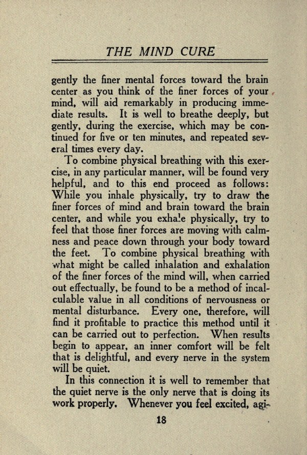 To combine physical breathing with this exercise, in any particular manner, will be found very helpful, and to this end proceed as follows: While you inhale physically, try to draw the finer forces of mind and brain toward the brain center, and while you exhale physically, try to feel that those finer forces are moving with calmness and peace down through your body toward the feet. To combine physical breathing with what might be called inhalation and exhalation of the finer forces of the mind will, when carried out effectually, be found to be a method of incalculable value in all conditions of nervousness or mental disturbance. Every one, therefore, will find it profitable to practice this method until it can be carried out to perfection. When results begin to appear, an inner comfort will be felt that is delightful, and every nerve in the system will be quiet.