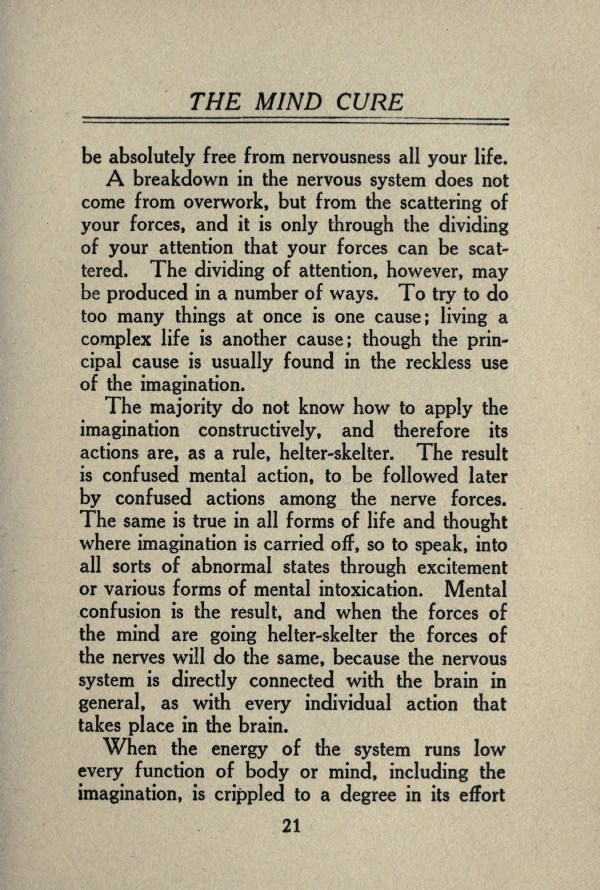 A breakdown in the nervous system does not come from overwork, but from the scattering of your forces, and it is only through the dividing of your attention that your forces can be scattered. The dividing of attention, however, may be produced in a number of ways. To try to do too many things at once is one cause; living a complex life is another cause; though the principal cause is usually found in the reckless use of the imagination.