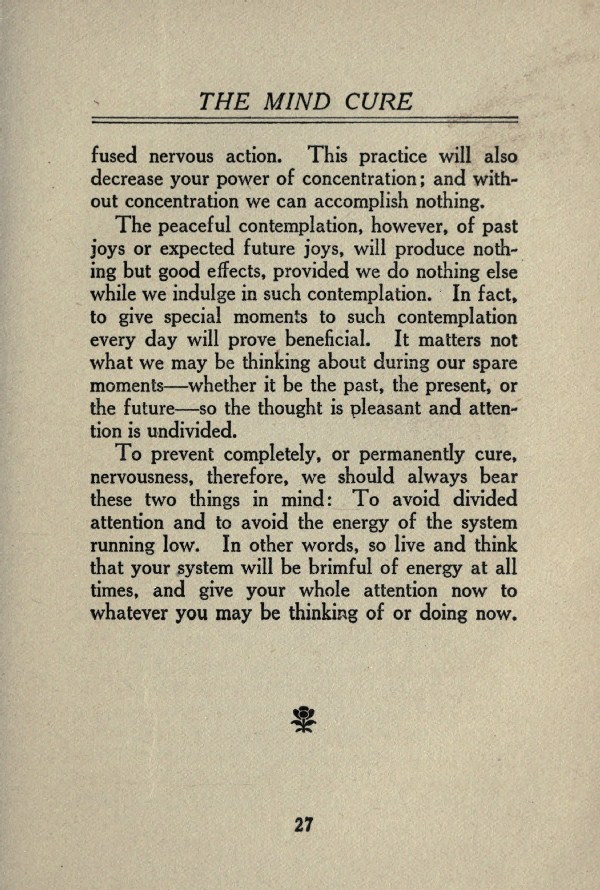 To prevent completely, or permanently cure, nervousness, therefore, we should always bear these two things in mind: To avoid divided attention and to avoid the energy of the system running low. In other words, so live and think that your system will be brimful of energy at all times, and give your whole attention now to whatever you may be thinking of or doing now.