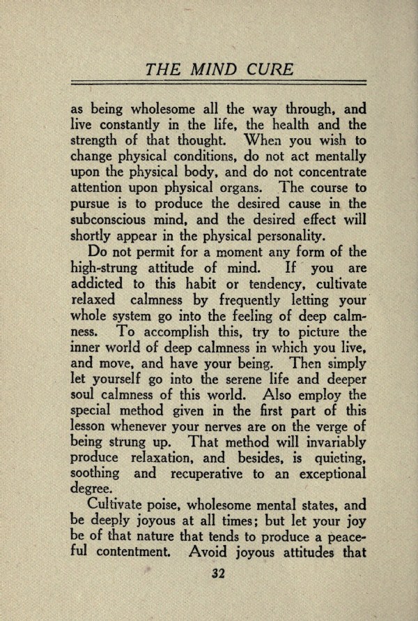 Do not permit for a moment any form of the high-strung attitude of mind. If you are addicted to this habit or tendency, cultivate relaxed calmness by frequently letting your whole system go into the feeling of deep calmness. To accomplish this, try to picture the inner world of deep calmness in which you live, and move, and have your being. Then simply let yourself go into the serene life and deeper soul calmness of this world. Also employ the special method given in the first part of this lesson whenever your nerves are on the verge of being strung up. That method will invariably produce relaxation, and besides, is quieting, soothing and recuperative to an exceptional degree.