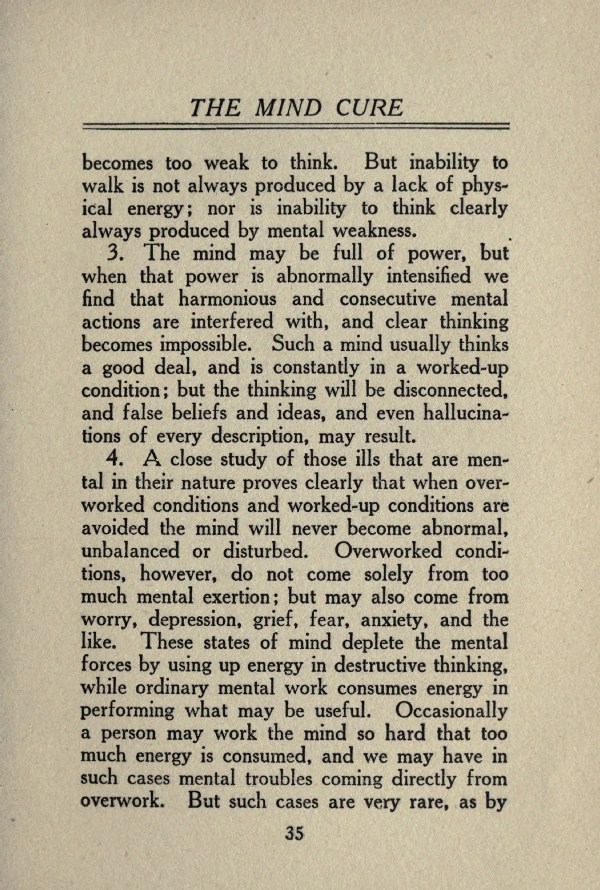 4. A close study of those ills that are mental in their nature proves clearly that when overworked conditions and worked-up conditions are avoided the mind will never become abnormal, unbalanced or disturbed. Overworked conditions, however, do not come solely from too much mental exertion; but may also come from worry, depression, grief, fear, anxiety, and the like. These states of mind deplete the mental forces by using up energy in destructive thinking, while ordinary mental work consumes energy in performing what may be useful. Occasionally a person may work the mind so hard that too much energy is consumed, and we may have in such cases mental troubles coming directly from overwork. But such cases are very rare, as by