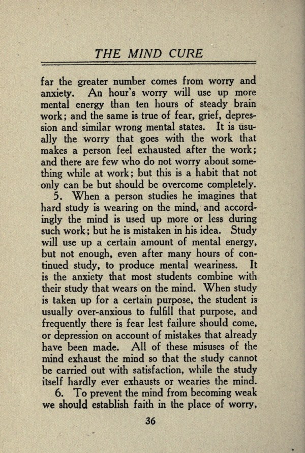 5. When a person studies he imagines that hard study is wearing on the mind, and accordingly the mind is used up more or less during such work; but he is mistaken in his idea. Study will use up a certain amount of mental energy, but not enough, even after many hours of continued study, to produce mental weariness. It is the anxiety that most students combine with their study that wears on the mind. When study is taken up for a certain purpose, the student is usually over-anxious to fulfill that purpose, and frequently there is fear lest failure should come, or depression on account of mistakes that already have been made. All of these misuses of the mind exhaust the mind so that the study cannot be carried out with satisfaction, while the study itself hardly ever exhausts or wearies the mind.